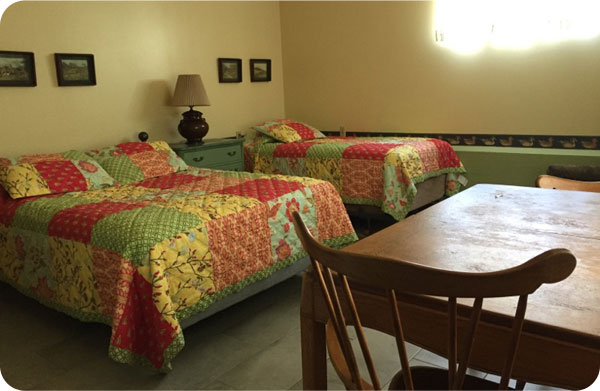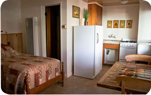 This studio sleeps 2, comes with a Full Size bed, a Twin bed and a full kitchen.